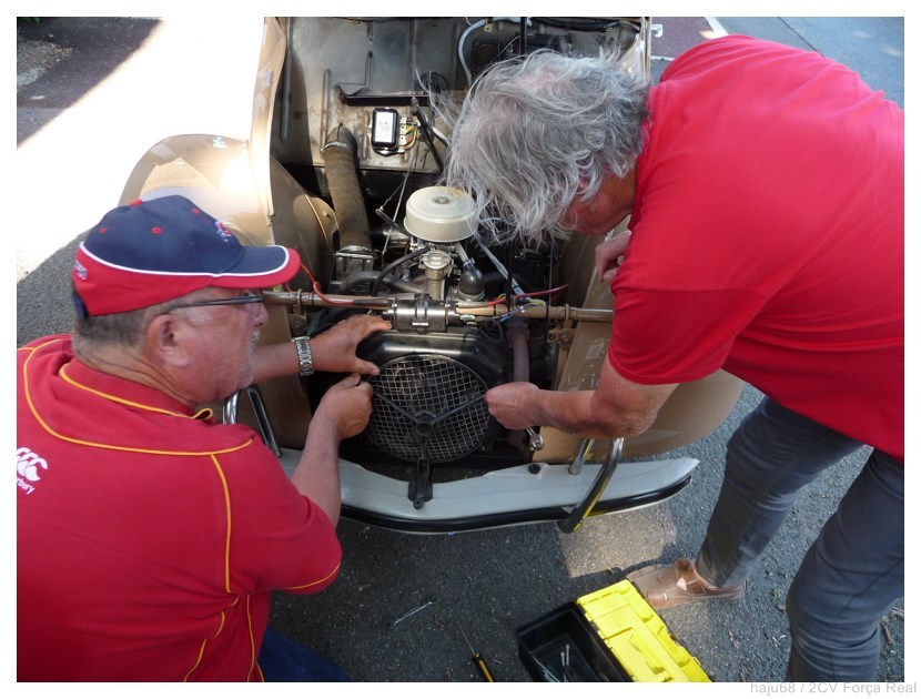 Petite panne à Vias. Le ventilateur présidentiel s'est dévissé. Mais une fois revissé il y a toujours un bruit. Un coup de chaud suite au ventilateur qui ventilait moins bien puisque desserré? Ou bien l'inverse, une grosse vibration sur le vilebrequin qui provoque le desserrement? |